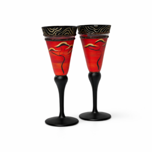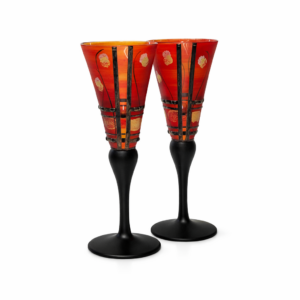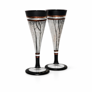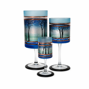 Ručně foukané sklenice na likér dekorované barvami a kovem. Obsah sklenic je 60 ml. Výrobek je autorsky signován, opatřen certifikátem originality.