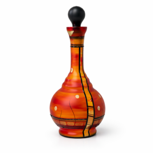 Karafa dekorovaná barvami a kovem . Signována autorským podpisem. K výrobku je přiložen certifikát původu. Dekorativní sklo.