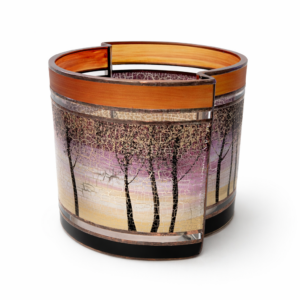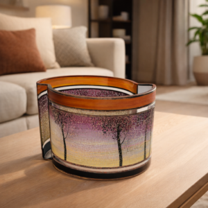 Ručně foukaná váza dekorovaná barvami a kovem .. Signována autorským podpisem. K výrobku je přiložen certifikát původu. Dekorativní sklo.