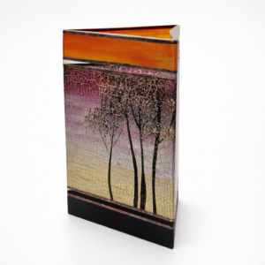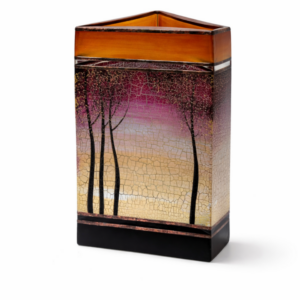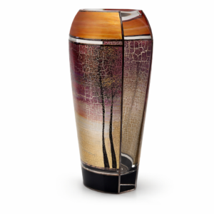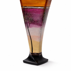 Ručně foukaná váza trojúhelníkového tvaru, dekorováná barvami a kovem. Výrobek je autorsky signován, opatřený certifikátem originality.