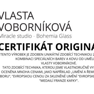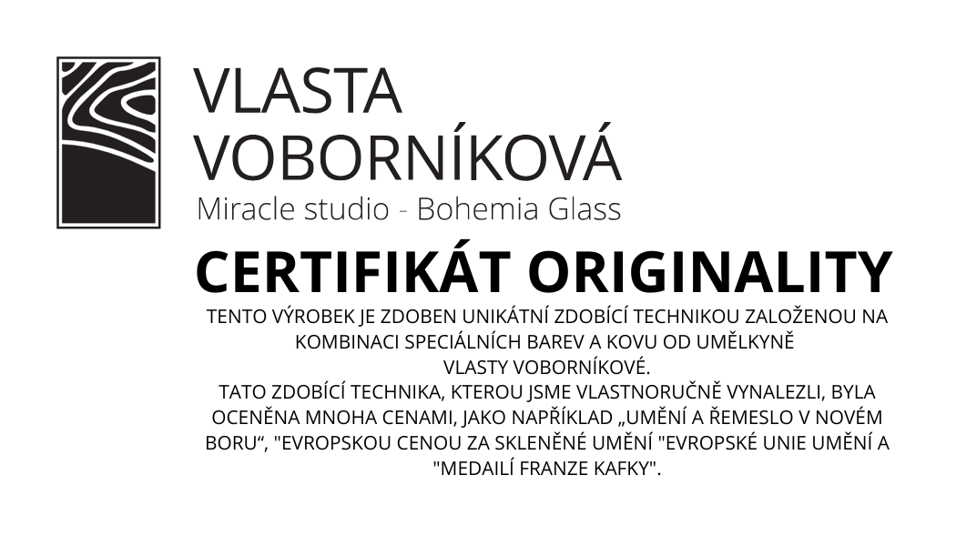 Ručně foukané sklenice na šampaňské, dekorováné barvami a kovem. Výrobek je autorsky signován, opatřený certifikátem originality.