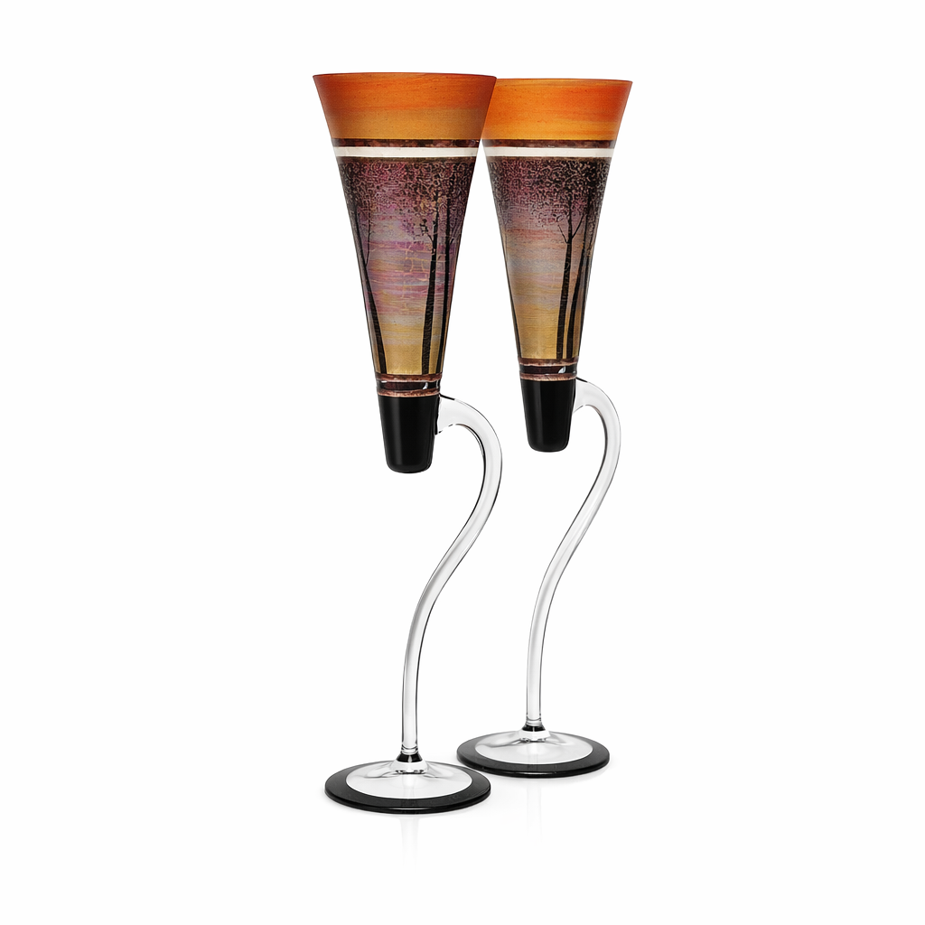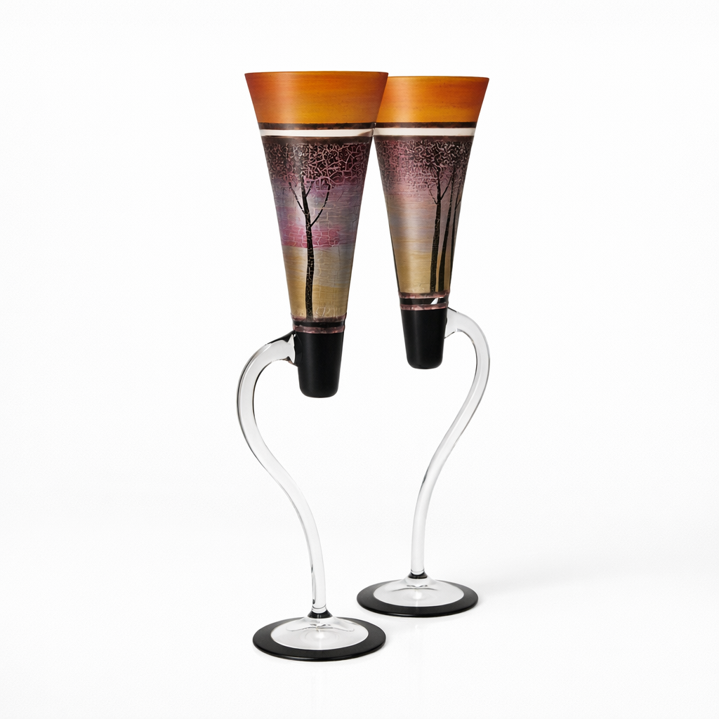 Ručně foukané sklenice na šampaňské s neobvyklou nožkou, dekorováné barvami a kovem. Výrobek je autorsky signován, opatřený certifikátem originality.