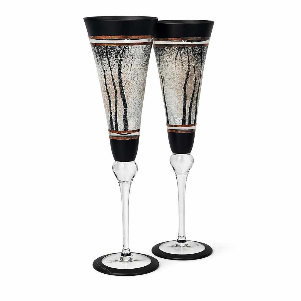 Ručně foukané sklenice na šampaňské, dekorováné barvami a kovem. Výrobek je autorsky signován, opatřený certifikátem originality.