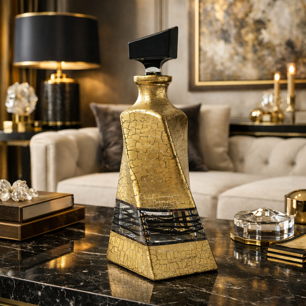 Karafa dekorovaná barvami a kovem s neobvykým tvarem.