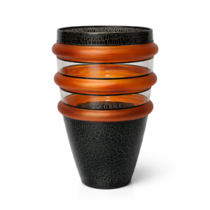 Ručně foukaná váza dekorovaná barvami a kovem .. Signována autorským podpisem. K výrobku je přiložen certifikát původu. Dekorativní sklo.