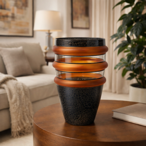 Ručně foukaná váza, dekorovaná barvami a kovem.