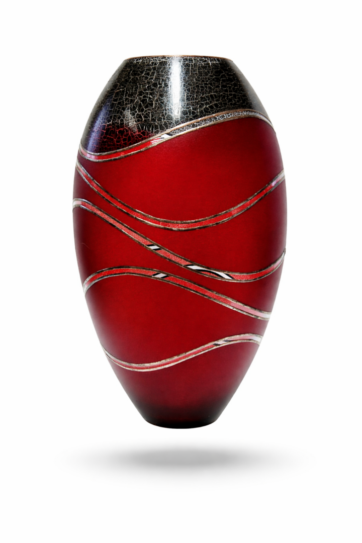 Ručně foukaná váza, dekorováná kovem a barvami . Výrobek je autorsky signován, opatřený certifikátem originality.