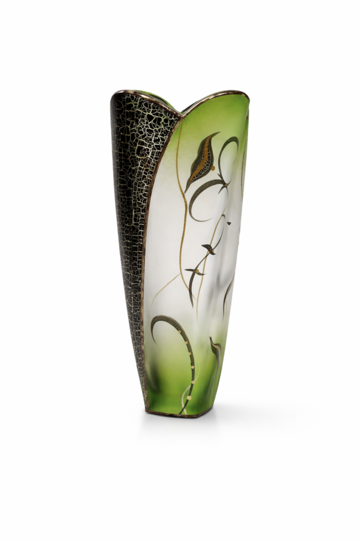 Ručně foukaná váza, dekorováná barvami a kovem. Výrobek je autorsky signován, opatřený certifikátem originality.