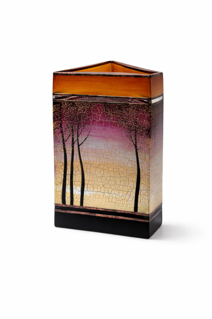 Ručně foukaná váza trojúhelníkového tvaru, dekorováná barvami a kovem. Výrobek je autorsky signován, opatřený certifikátem originality.