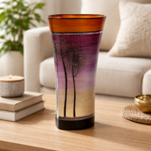 Ručně foukaná váza , dekorováná barvami a kovem. Výrobek je autorsky signován, opatřený certifikátem originality.