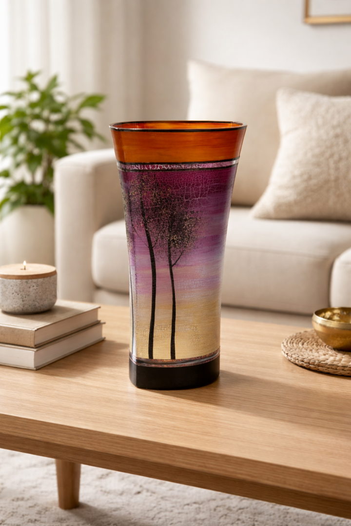 Ručně foukaná váza , dekorováná barvami. Výrobek je autorsky signován, opatřený certifikátem originality.