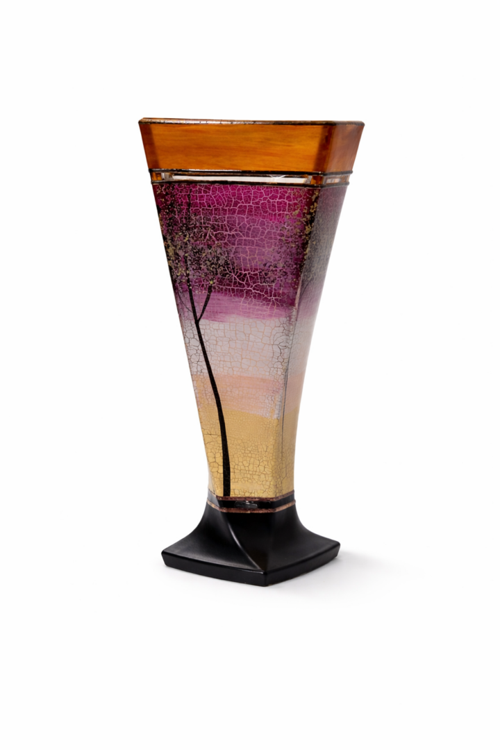 Ručně foukaná váza, dekorováná barvami a kovem. Výrobek je autorsky signován, opatřený certifikátem originality.
