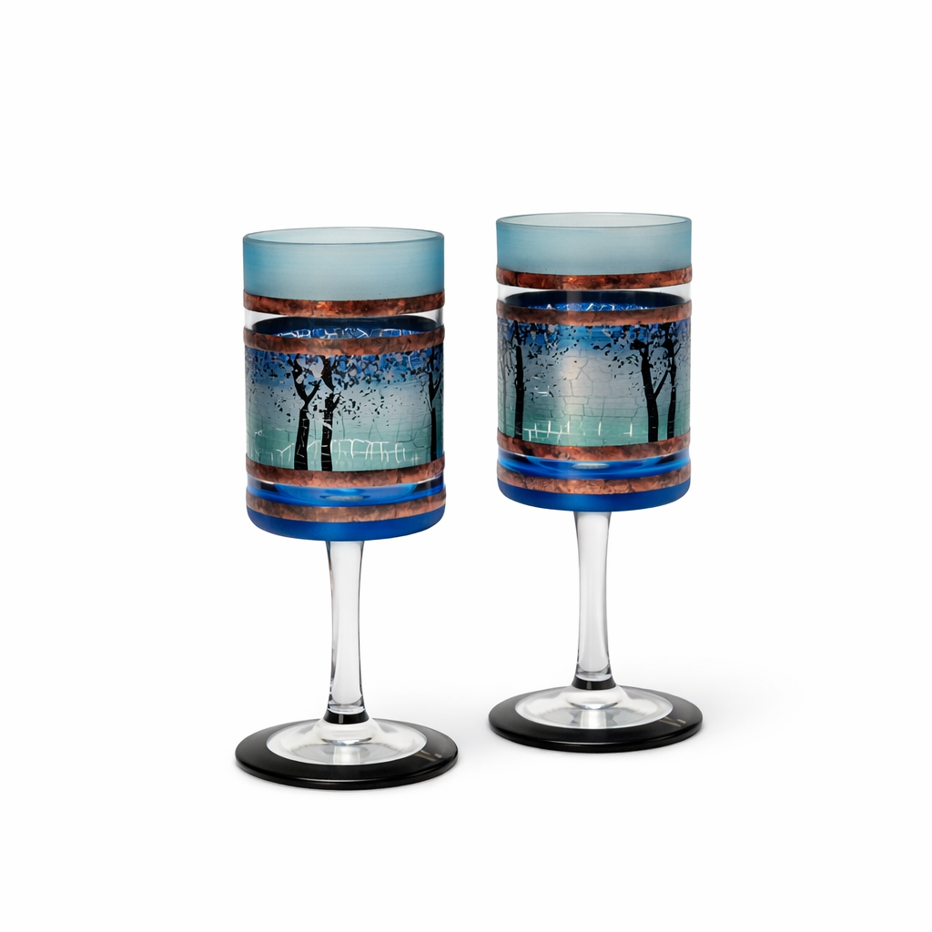 Ručně foukané sklenice na víno dekorované barvami a kovem.