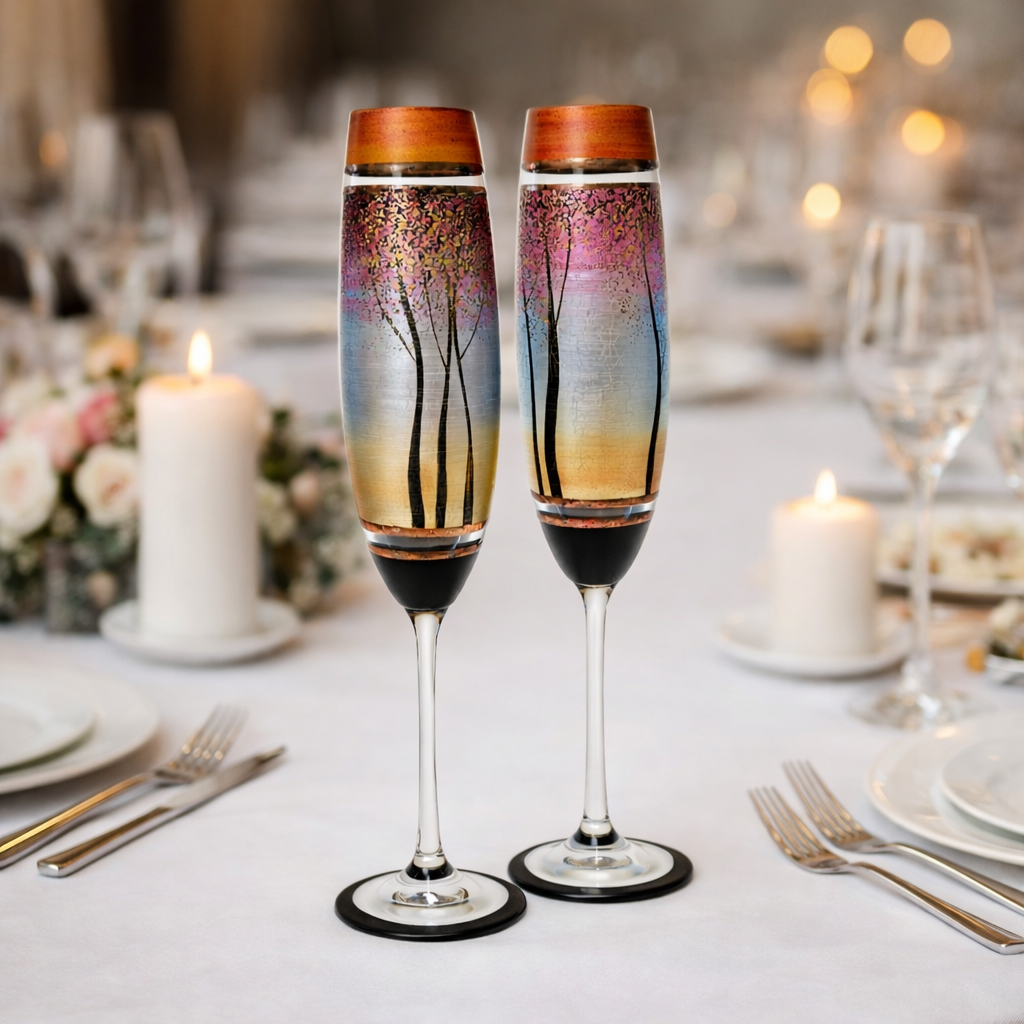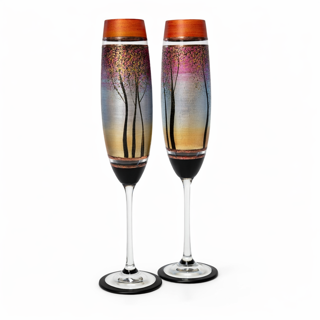 Ručně foukané sklenice na šampaňské, dekorováné barvami a kovem. Výrobek je autorsky signován, opatřený certifikátem originality.