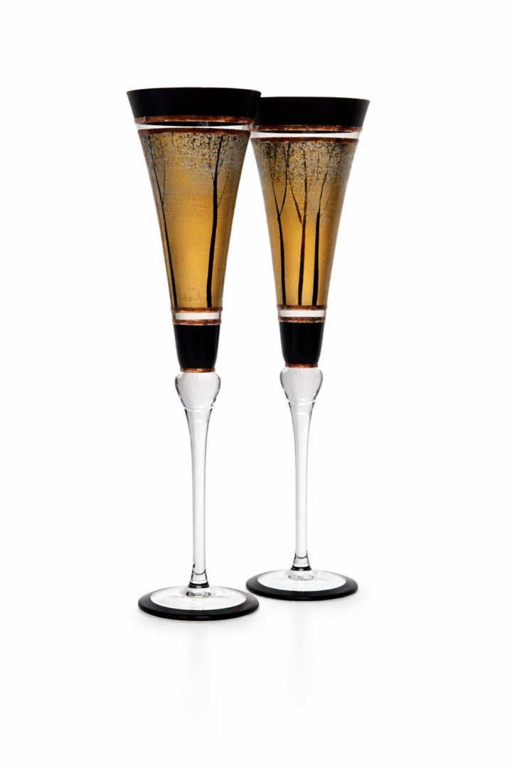 Ručně foukané sklenice na šampaňské, dekorováné barvami a kovem. Výrobek je autorsky signován, opatřený certifikátem originality.