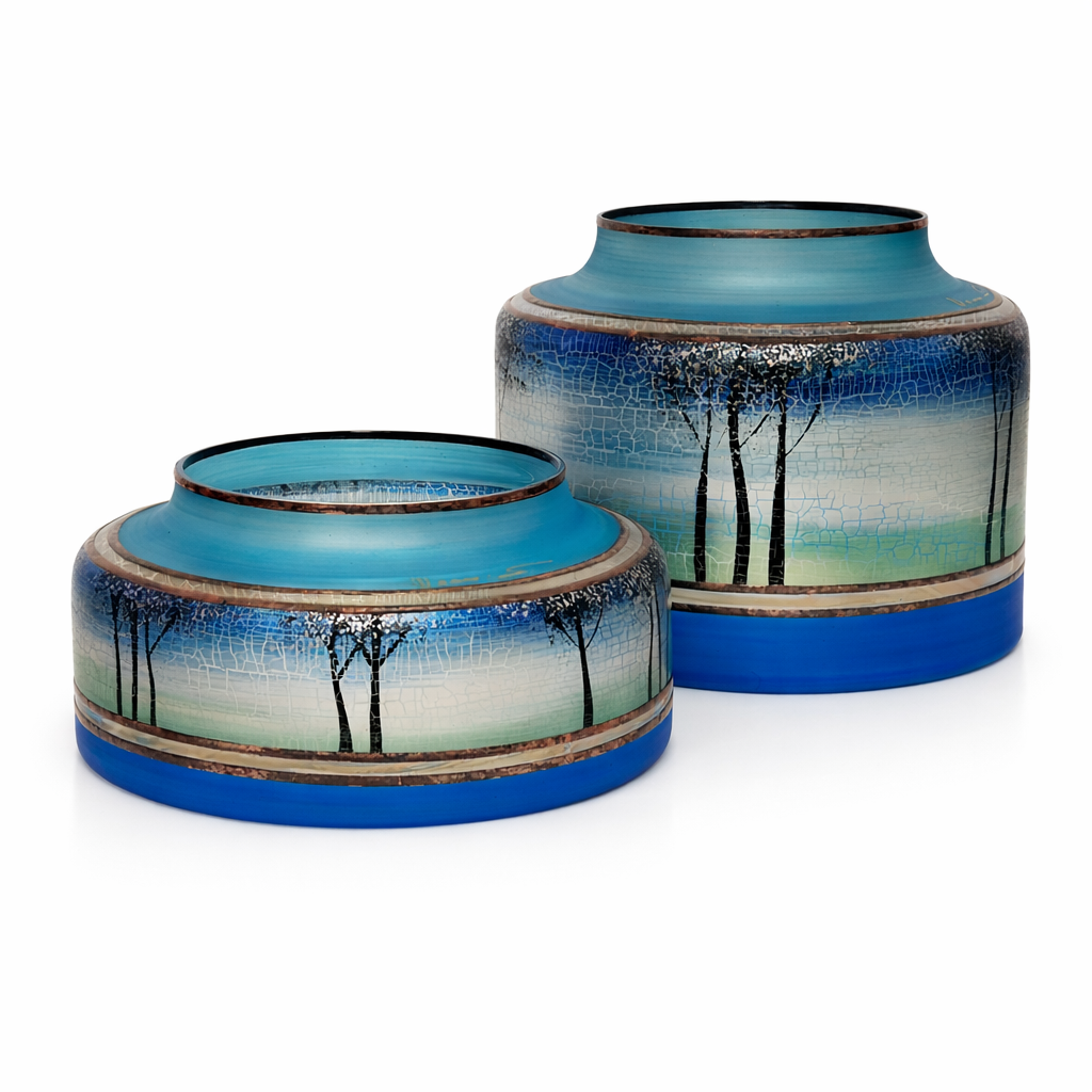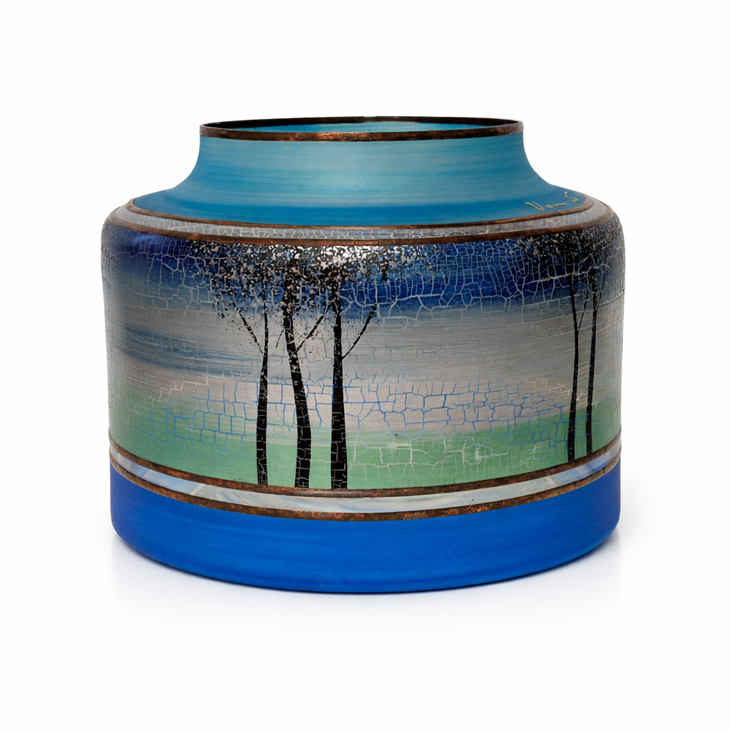 Ručně foukaná váza dekorovaná barvami a kovem .. Signována autorským podpisem. K výrobku je přiložen certifikát původu. Dekorativní sklo.