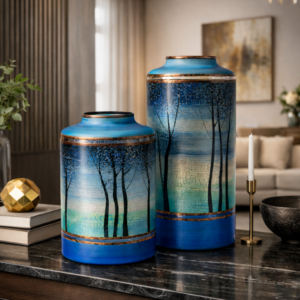 Ručně dekorovaná váza barvami a kovem.