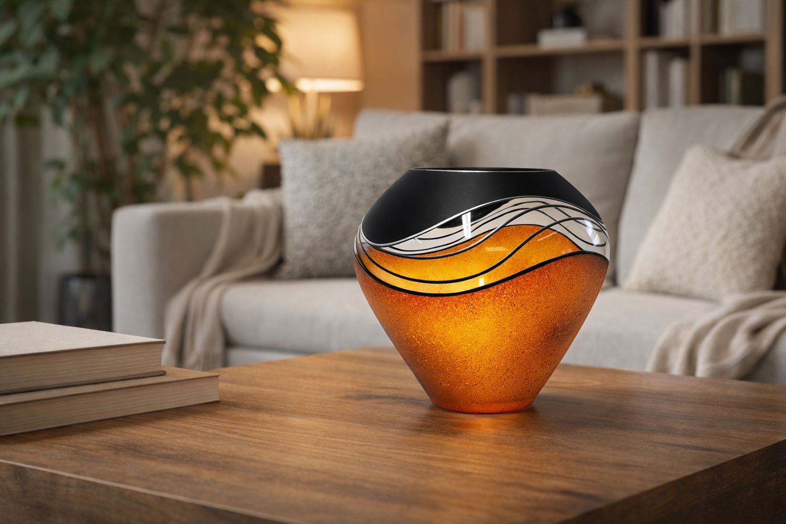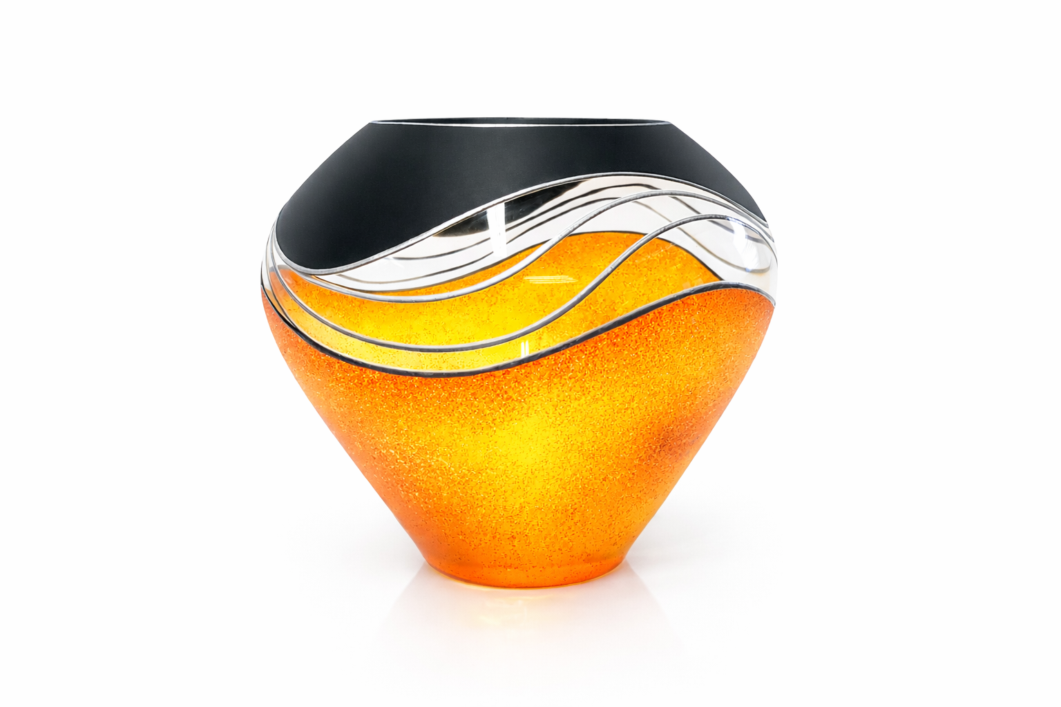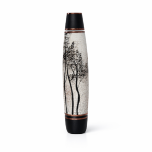 Ručně foukaná váza dekorovaná barvami a kovem. Výrobek je opatřen autorským podpisem a certifikátem originality.