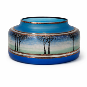 Ručně foukaná váza dekorovaná barvami a kovem. Výrobek je opatřen autorským podpisem a certifikátem originality.
